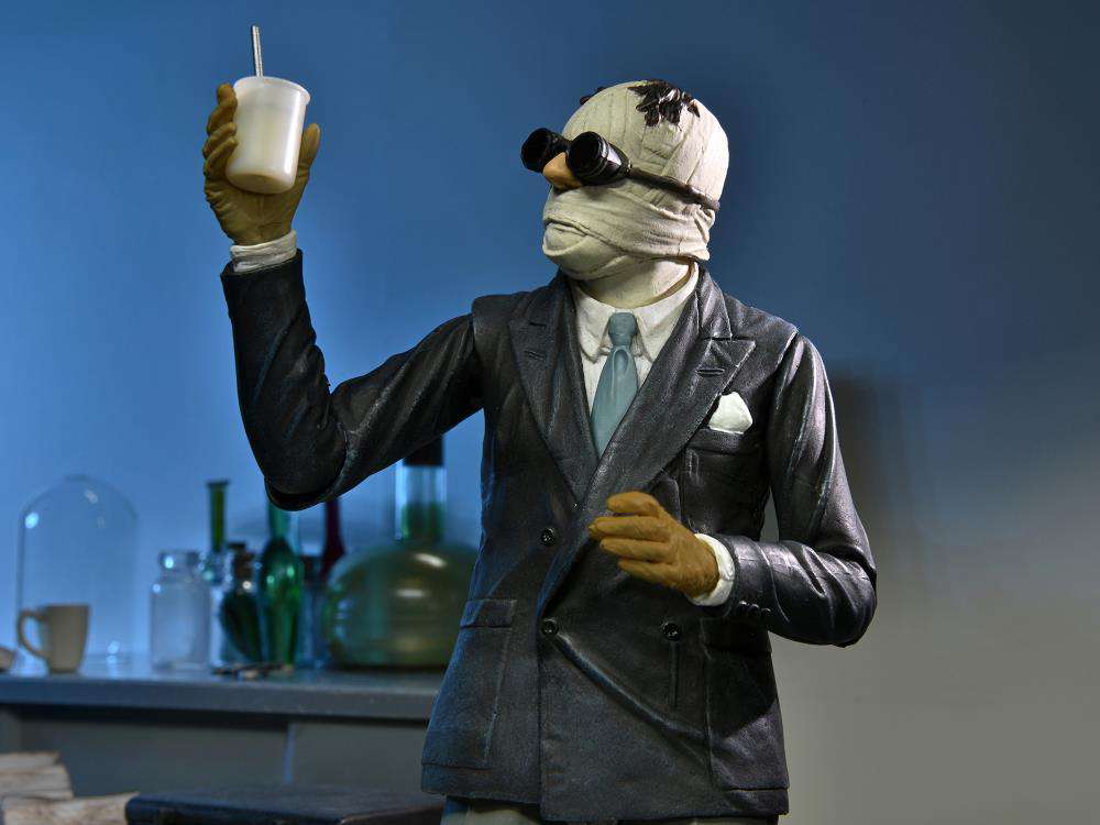 For the 90th anniversary of Universal's sci-fi horror film classic, NECA is excited to reveal The Invisible Man in Ultimate action figure form! Starring Claude Rains, 1933's The Invisible Man was based on the classic H.G. Wells novel and received critical acclaim, eventually being placed on the U.S. National Film Registry for its historical significance. The interchangeable heads capture the seemingly solid wrapped version as well as partially uncovered versions with peeks at the insane emptiness within. Also included are interchangeable wrapped and gloved hands, goggles, nose, notebook, wig, and cup with straw. The figure stands in 7” scale and comes in display-friendly window box packaging with opening front flap.