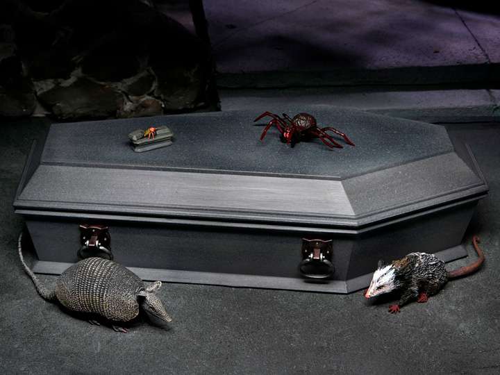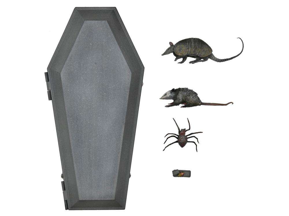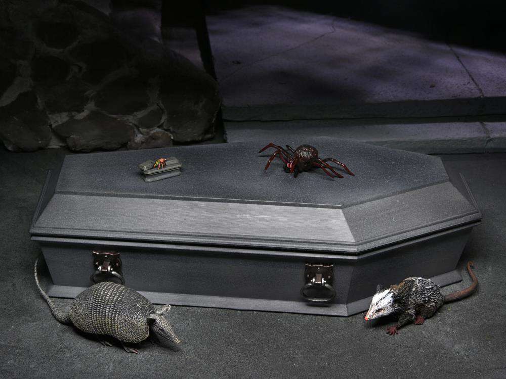 Build even bigger scenes and dioramas with this accessory set for NECA’s Universal Monsters Dracula action figure! The centerpiece of the set is the large coffin, which measures almost 9” inches long and opens to fit your Dracula figure inside (figure sold separately). The set also includes armadillo, large spider, cricket in coffin, and opossum accessories. Closed box packaging.
