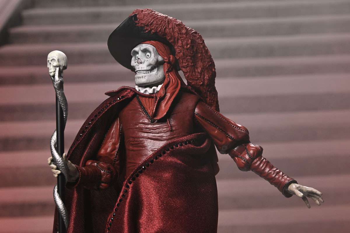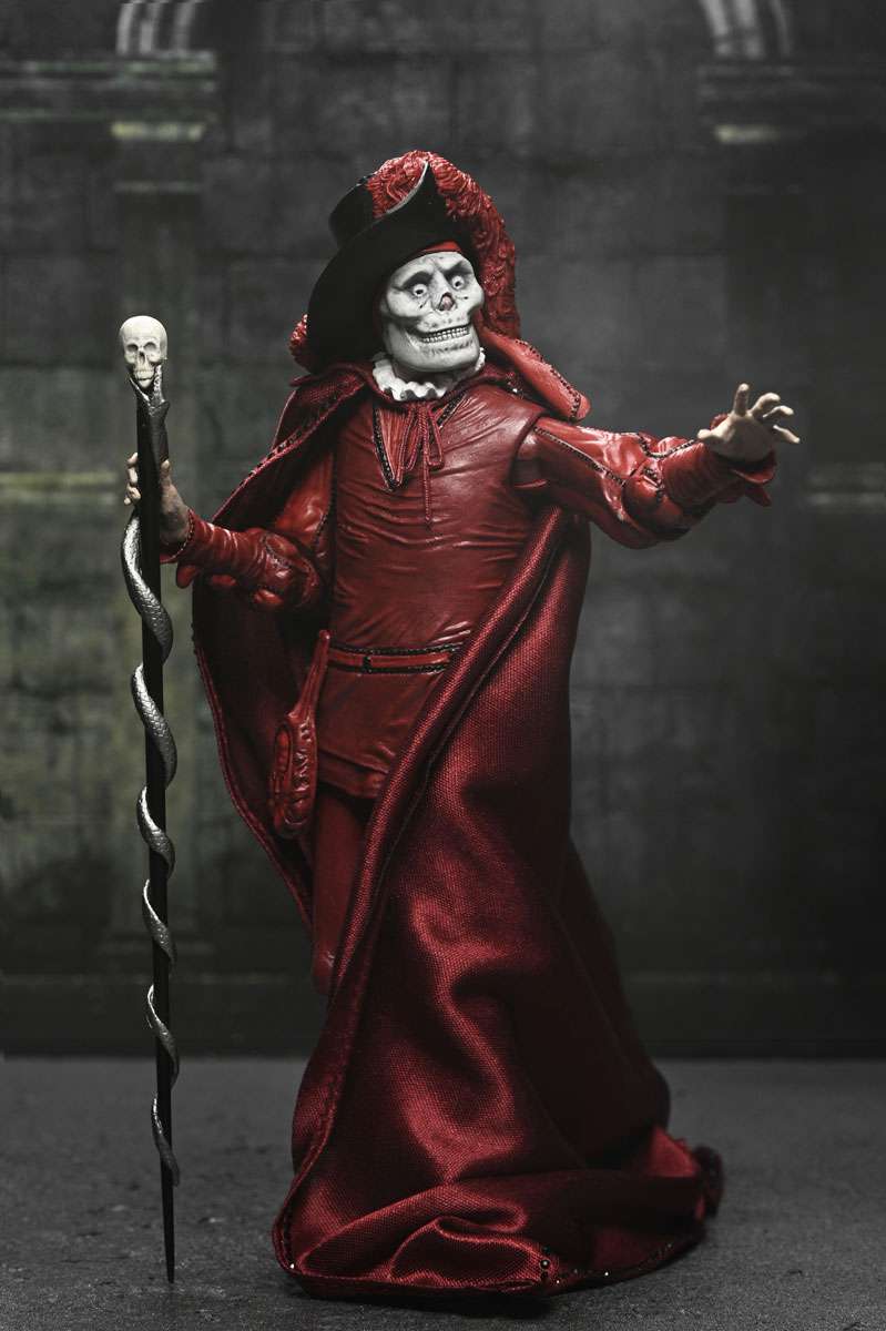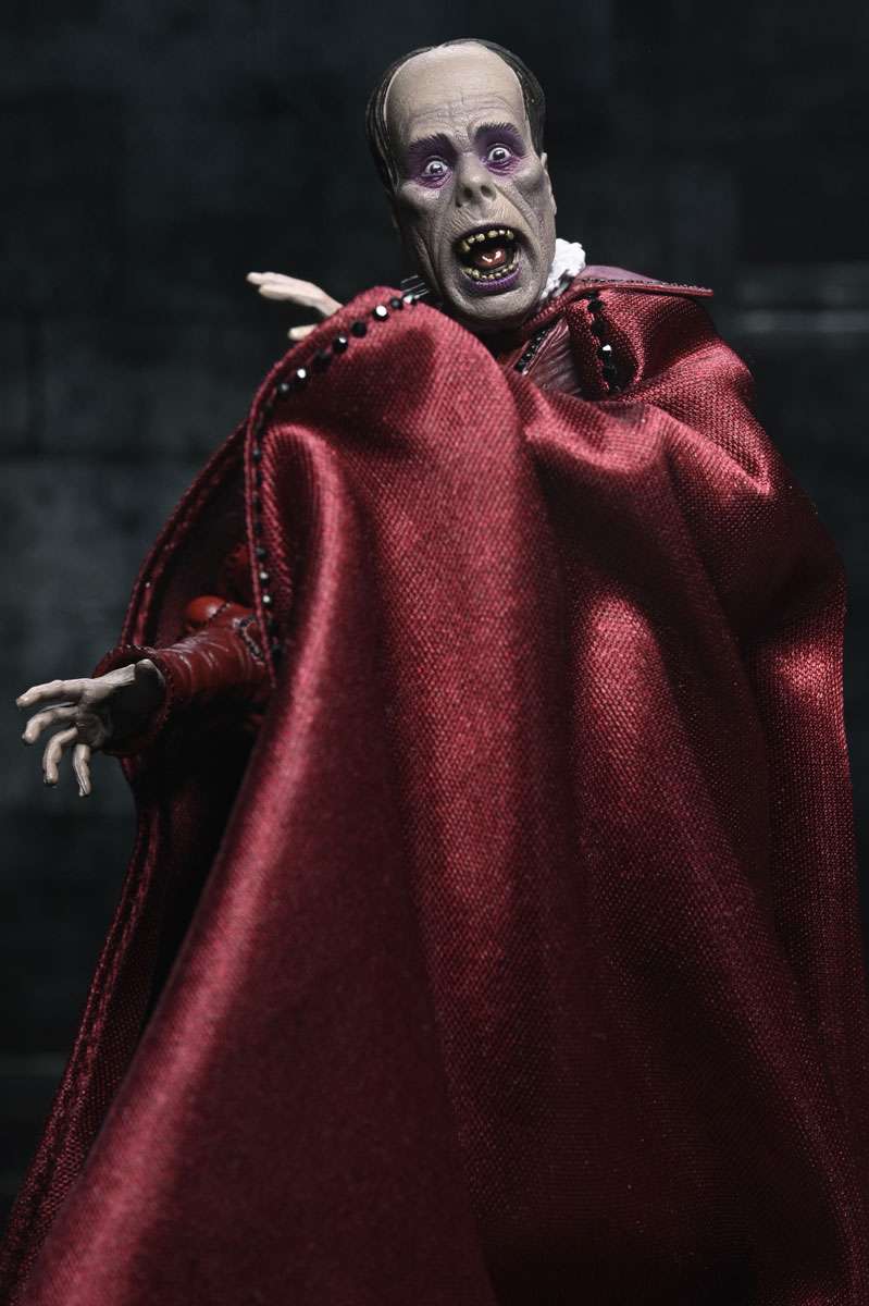 Celebrate a century of cinematic horror! Mark the 100th anniversary of the 1925 silent film The Phantom of the Opera with this stunning action figure from NECA. Featuring the Phantom (Erik) in his iconic "Red Death" disguise from the masquerade ball, this 7-inch scale figure captures the haunting elegance of Lon Chaney’s classic portrayal. Hiding his disfigured face beneath the skull mask, he spies on Christine and Raoul on the rooftop of the Paris Opera House. This collectible includes a soft goods cloak, large brim hat, and skull staff accessories. Plus, multiple heads and hands, which are interchangeable with other NECA Phantom of the Opera figures (sold separately). Presented in a collector-friendly box with an opening front flap, this figure is a must-have for horror fans and classic film collectors alike!