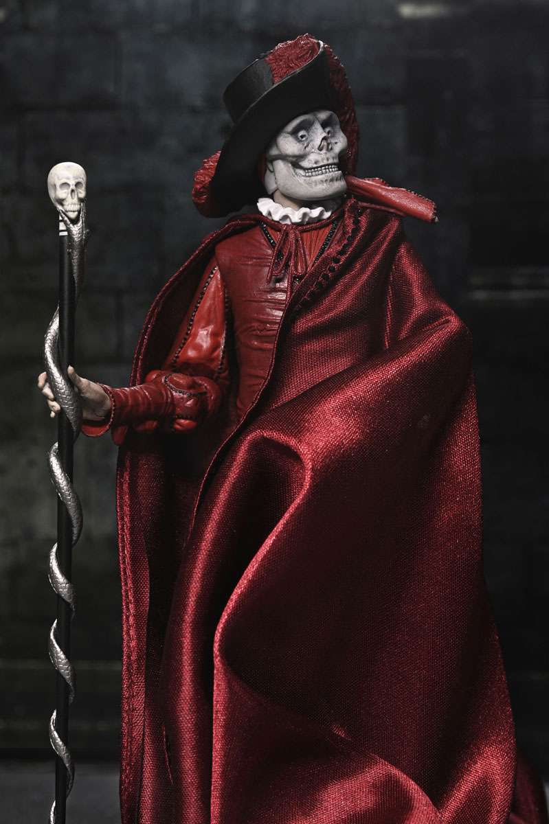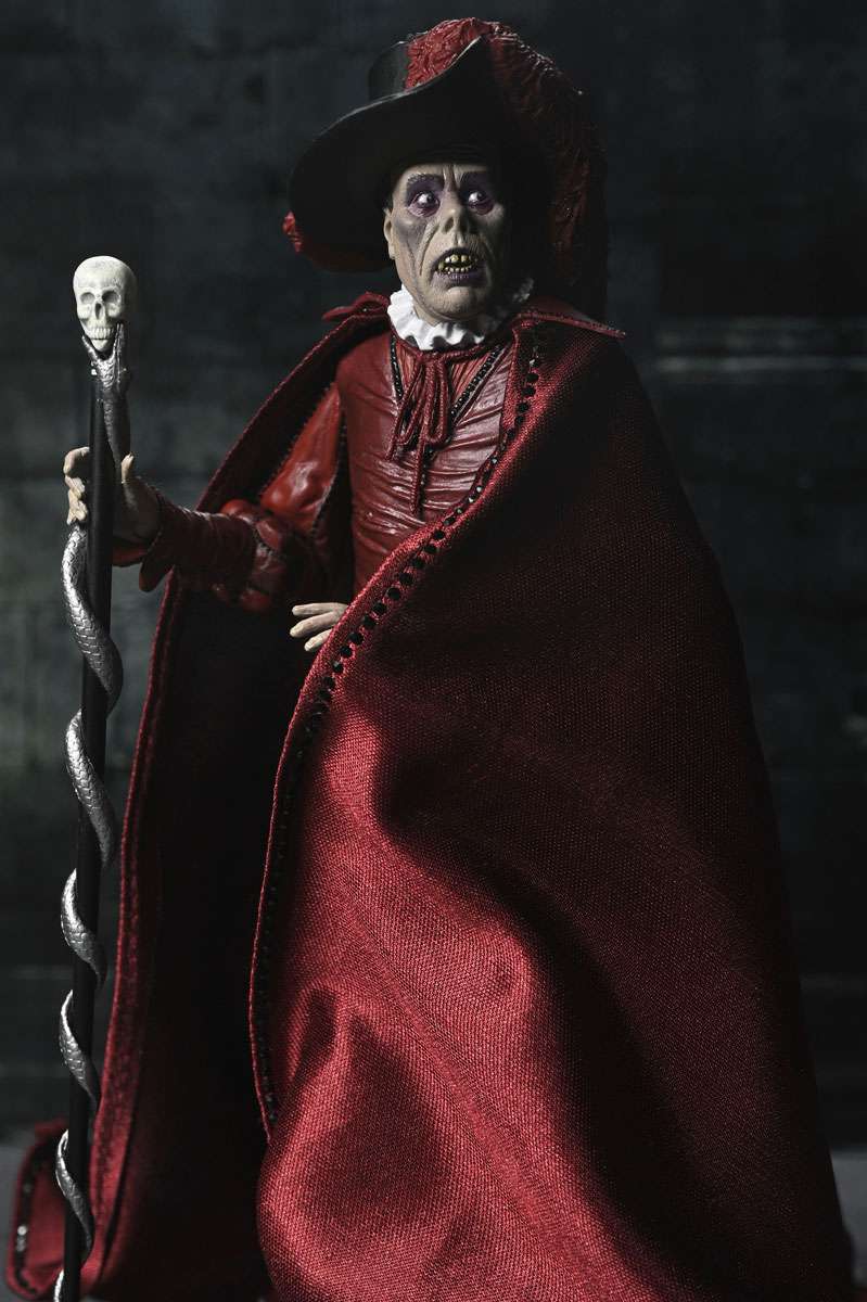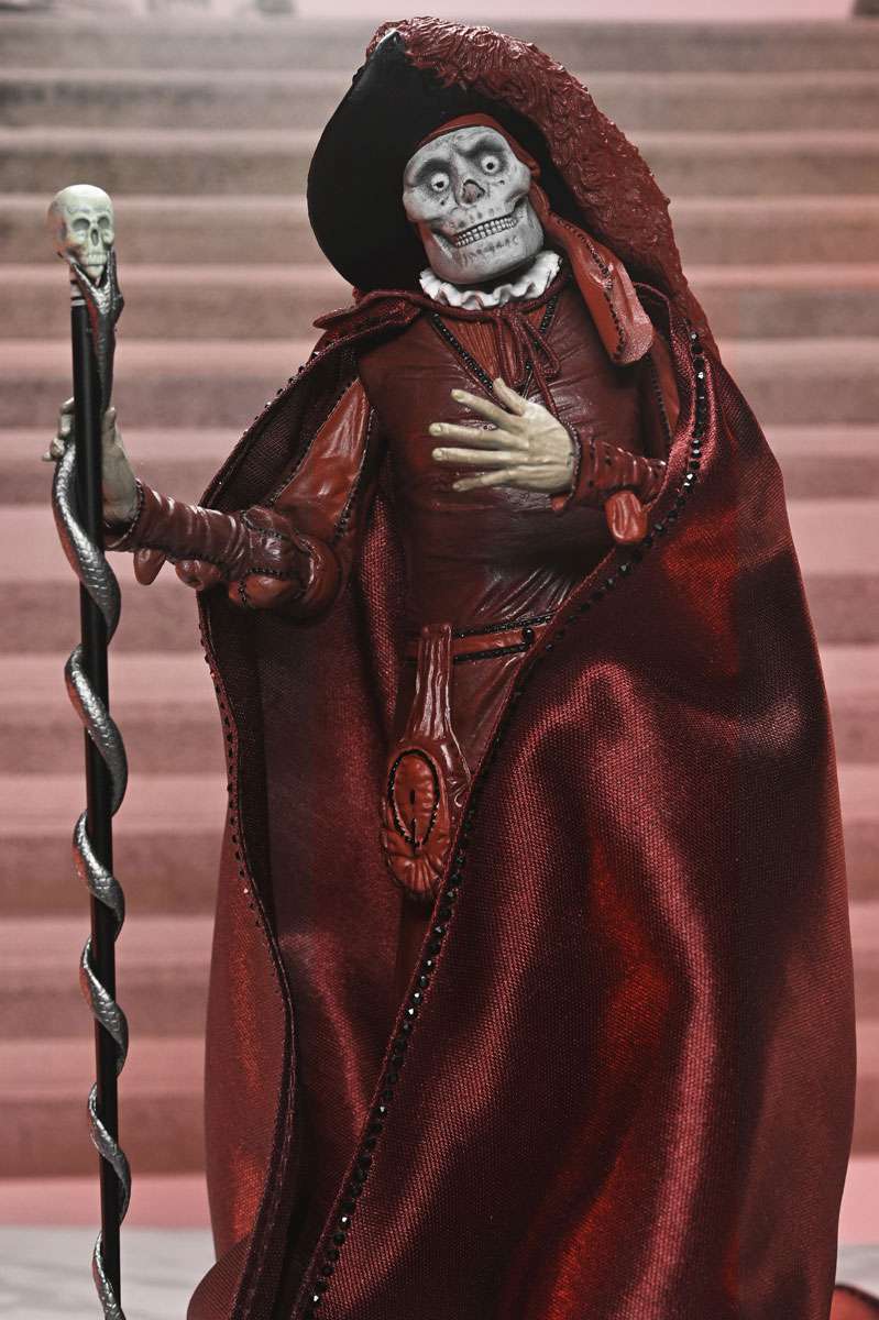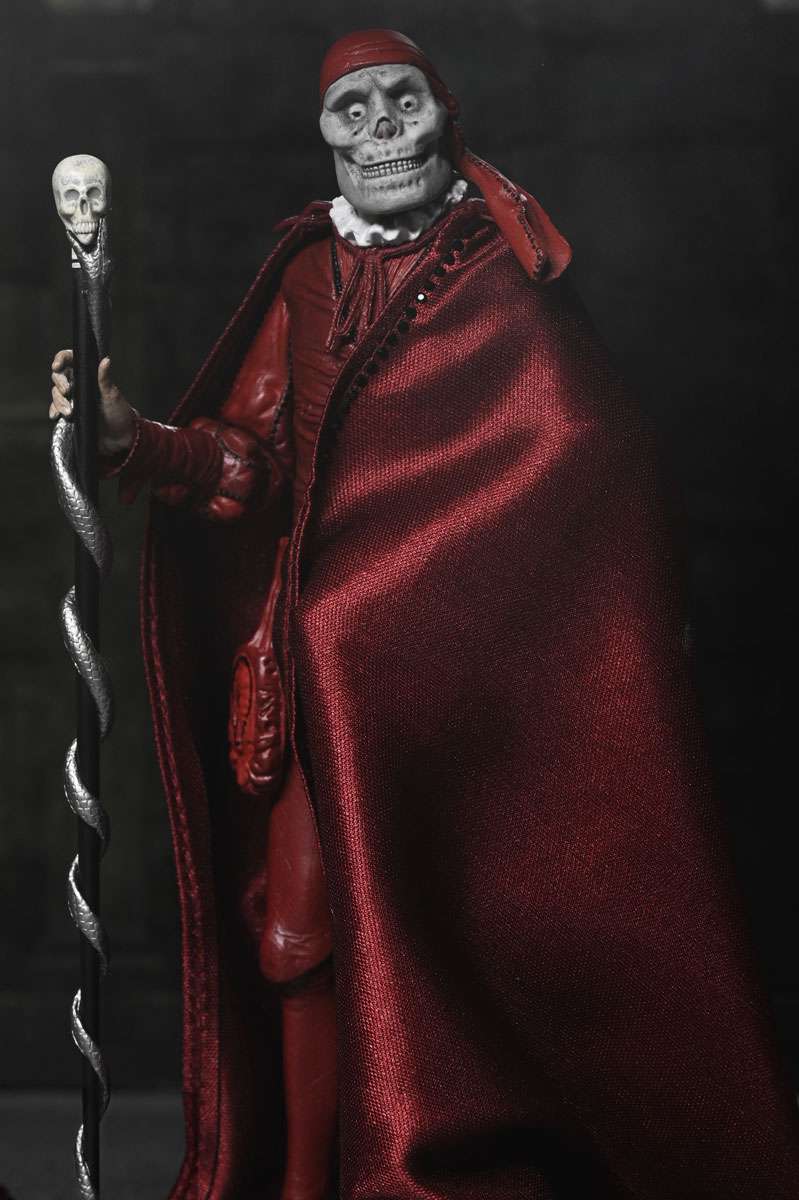 Celebrate a century of cinematic horror! Mark the 100th anniversary of the 1925 silent film The Phantom of the Opera with this stunning action figure from NECA. Featuring the Phantom (Erik) in his iconic "Red Death" disguise from the masquerade ball, this 7-inch scale figure captures the haunting elegance of Lon Chaney’s classic portrayal. Hiding his disfigured face beneath the skull mask, he spies on Christine and Raoul on the rooftop of the Paris Opera House. This collectible includes a soft goods cloak, large brim hat, and skull staff accessories. Plus, multiple heads and hands, which are interchangeable with other NECA Phantom of the Opera figures (sold separately). Presented in a collector-friendly box with an opening front flap, this figure is a must-have for horror fans and classic film collectors alike!