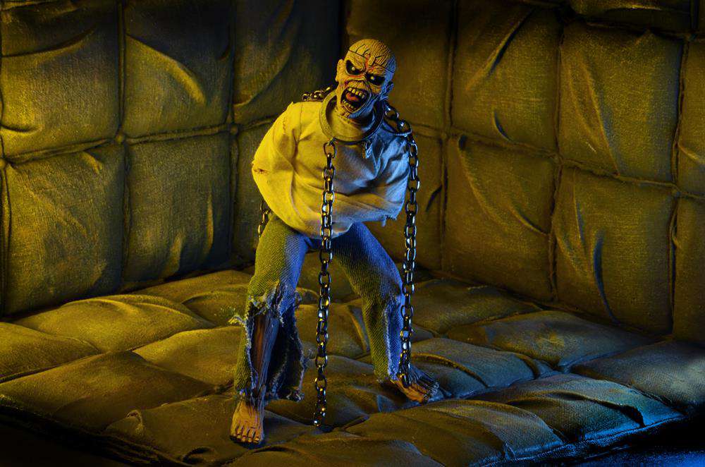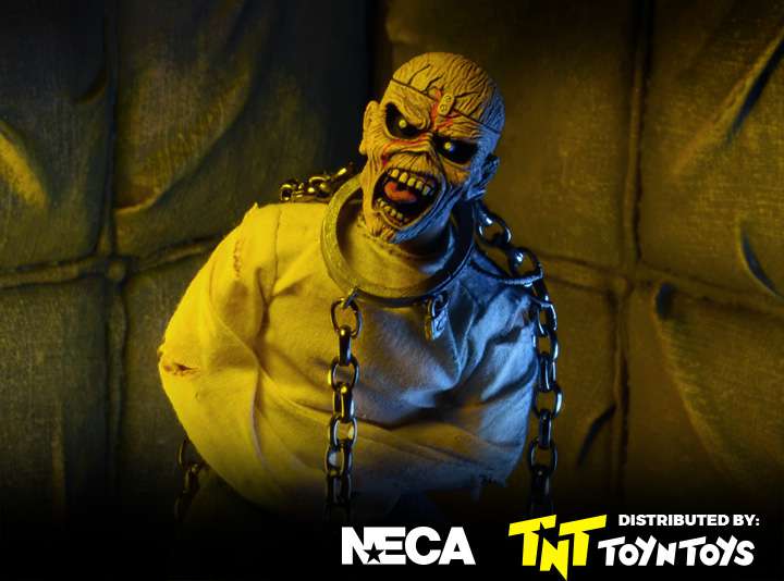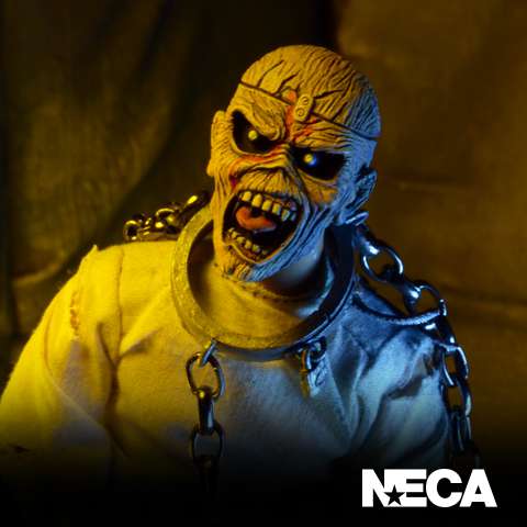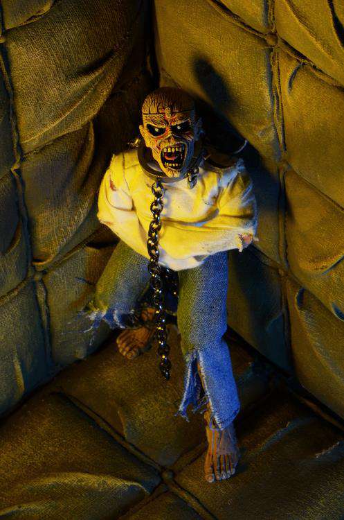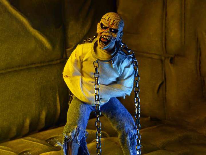 Straight from the cover of Iron Maiden's 1983 album Piece of Mind! This 8" tall action figure of classic metal mascot Eddie is dressed in fabric clothing and features real metal chains. Comes in blister card packaging with resealable protective clamshell.