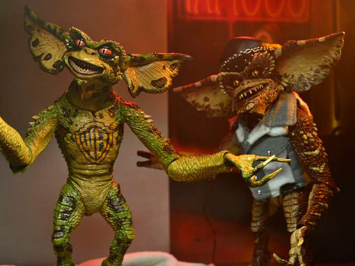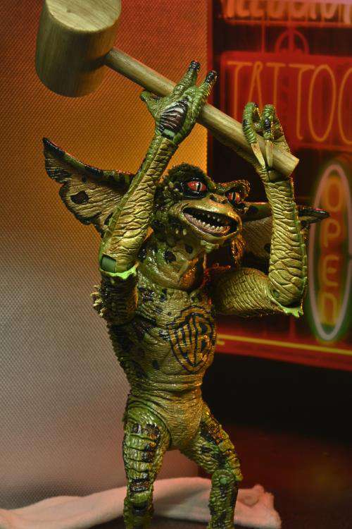 The Gremlins are back, and this time they've taken control of a high-tech skyscraper in New York City! From the sequel movie Gremlins 2: New Batch, these two 7" scale, fully articulated Gremlins figures (approximately 6" tall) have taken up residence in a tattoo parlor and are ready to show off their new ink. They come with interchangeable hands, tattoo instrument, mallet, sunglasses, riding crop, plus fabric towel and jean vest. Window box packaging.