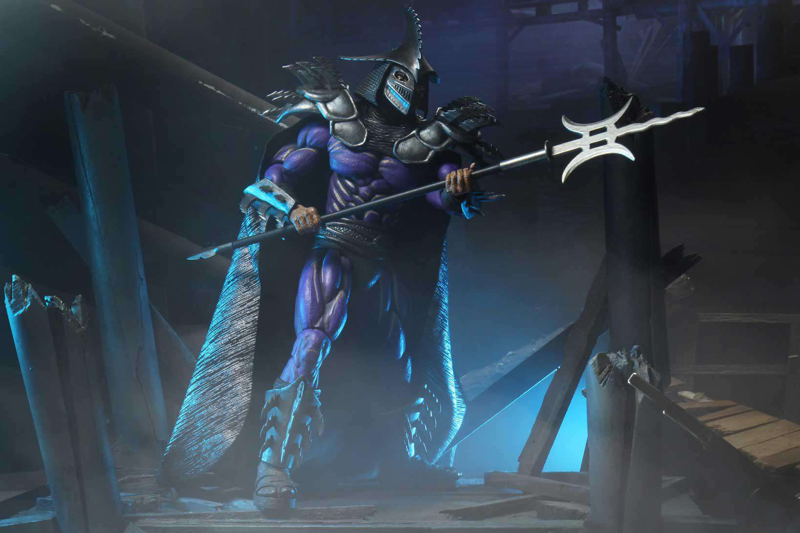 Based off of his appearance at the end of Teenage Mutant Ninja Turtles 2: The Secret of the Ooze, Super Shredder stands over 8" tall and comes with an all fabric cape, interchangeable hands, a bishamon yari, and a TGRI canister. Window box packaging