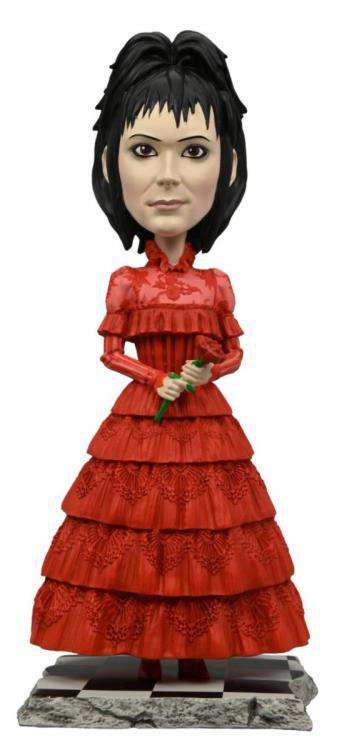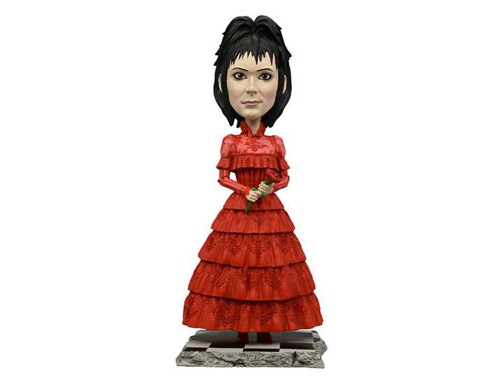Celebrate the 2024 Tim Burton film Beetlejuice Beetlejuice with this Lydia Deetz Head Knocker! When Lydia’s rebellious daughter, Astrid, accidentally opens the portal to the Afterlife, it’s only a matter of time until someone says Beetlejuice’s name three times! Lydia is dressed in her red wedding dress, making her a colorful, collectible piece for any Beetlejuice fan. Measuring over 8 inches tall, this hand-painted resin figure features a spring mechanism that allows for head bobble movement, creating interactive fun whenever you want it. Add her to your horror display and let everyone know just how much you love Beetlejuice...Beetlejuice...