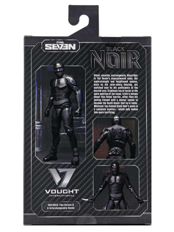 From The Boys, the hit TV adaptation of the popular comic book series! No one knows what hides behind the mask of Black Noir, the Seven's superpowered ninja... a mystery that makes his death-dealing skill even more terrifying. This 7" scale action figure features a detailed replica of the screen costume and comes with interchangeable hands and two knives that fit into sheaths on the figure's hips. Collector-friendly window box packaging with opening front panel.